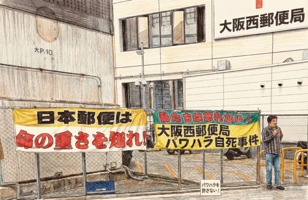 7 年前の2019年3月5日、大阪西郵便局で、29歳の青年が軽微な交通事故の後、局内で首を吊り命を絶ってしまいました。交通事故についての管理者の度を越した叱責が原因です。もっと生きたかったであろう彼の無念を、私たちは忘れることができません。そして、彼を死に追いやった管理者、また管理者を擁護し責任を取らない日本郵便・日本郵政を私たちは許せません。